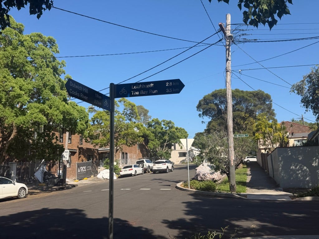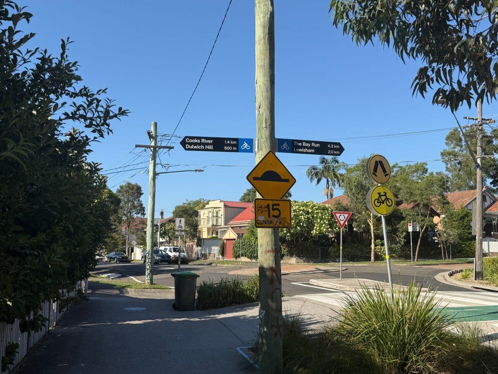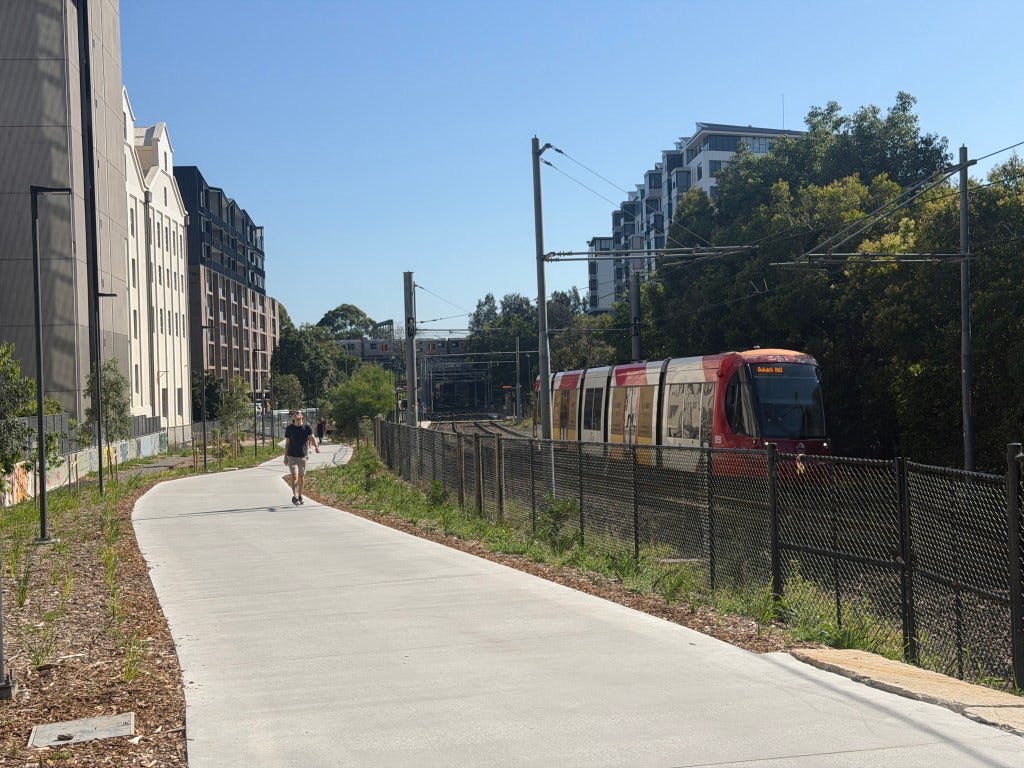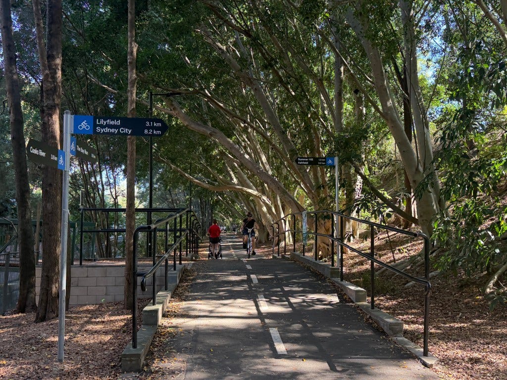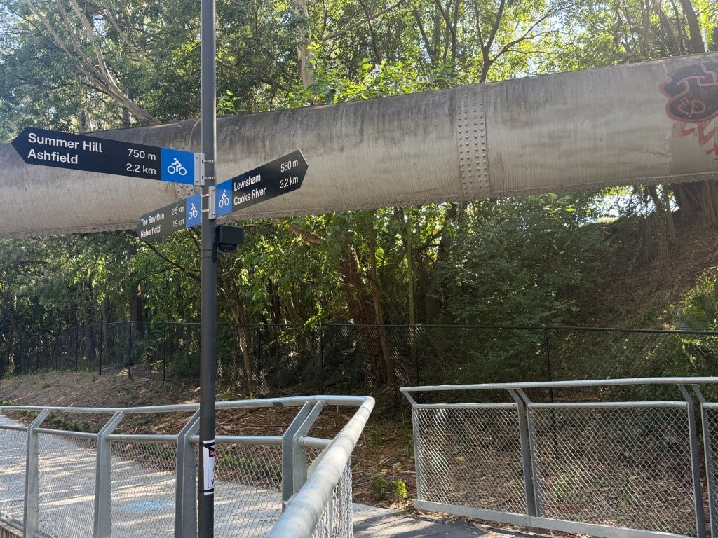 There are many wayfinding signs, though it is still a bit confusing to follow the first time, especially when it cross streets. I am not sure that is fixed by more signs rather than by a more self-explaining trail, or off-trail indicators. In any case, once you get on, it’s easy enough to follow in most places, since it parallels Sydney’s L1 Inner West LRT line, which is a former goods line that was converted to passenger service a decade ago, and is entirely grade-separated from cars outside of the CBD (though pedestrians can cross the tracks). The trail itself is mostly separated from traffic, but there are places that streets are crossed.