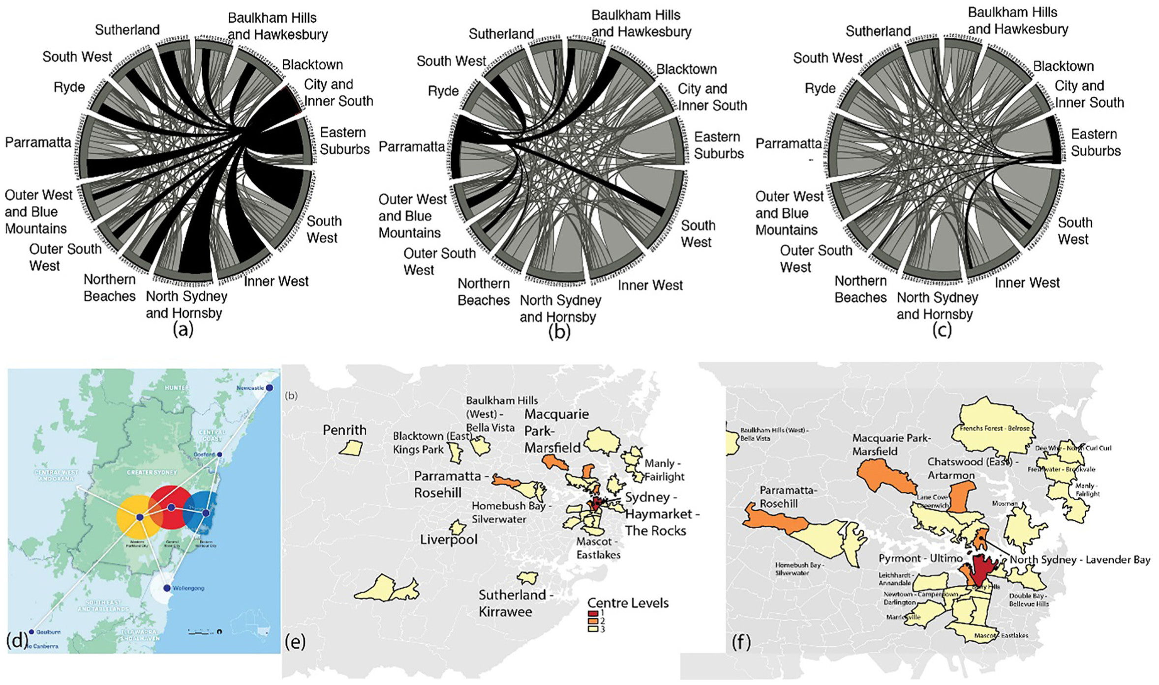 location-based metrics (e.g. employment density/total number of workers, above a threshold). While these metrics are good indicators of location ‘centricity’, results are sensitive to threshold choice. We consider the alternative idea that a centre’s status depends on its connectivity to other locations through trip inflows/outflows: this is inherently a network rather than placeidea. Three flow and network-based centricity metrics for measuring metropolitan area polycentricity using journey-to-work data are presented: (a) trip-based; (b) density-based; and (c) accessibility-based. Using these measures, polycentricity is computed and rank-centricity distributions are plotted to test Zipf-like or Christaller-like behaviours. Further, a percolation theory framework is proposed for the full origin–destination matrix, where trip flows are used as a thresholding parameter to count the number of sub-centres. Trip flows prove to be an effective measure to count and hierarchically organise metropolitan areas and sub-centres, tackling the arbitrariness of defining any threshold on employment statistics to count sub-centres. Applications on data from the Greater Sydney region show that the proposed framework helps to characterise polycentricity and sub-regional organisation more robustly, and provide unexpected insights into the connections between land use, labour market organisation, transport and urban structure.