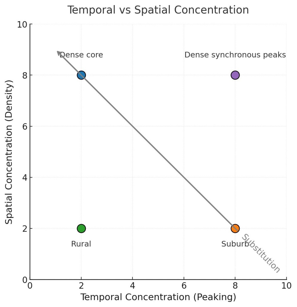 This chart makes the substitute or complement question concrete. Moving up increases spatial concentration, moving right increases temporal concentration. In some systems, more of one allows less of the other. In others, they move together.