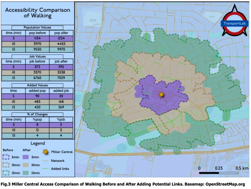 This research explores prioritizing network investment to improve walking and biking access in a suburban area with a poorly connected street network. This study's methods provide a systematic approach to design and prioritize the potential links to improve active travel in the suburban environment. An access-oriented ranking system is proposed to prioritize the contribution of links in two evaluation processes for different travel time thresholds. One of the developing suburbs in Sydney is selected as the case study, and a list of potential links is identified. Results indicate that links with the highest added access per unit of cost are the links that have the highest impact if all links are built. However, the locational network structure surrounding the point of interest may affect the order. For a radial network, closer links lead to higher access, while for a tree-like network structure, connecting branches improve access significantly. Also, farther potential links are significantly dependent on the closer links in increasing accessibility for a specific location. This suggests that in order to utilize the network, there should be a sequence in constructing the potential links. The application of access-oriented network investment is also discussed.