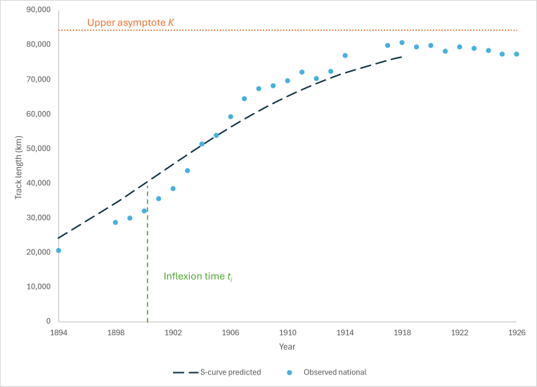 We compile operating track lengths for US streetcar and interurban systems from the McGraw American Street Railway Investments Directories for 1894–1926, aggregated by state and by metro area, with a national total. The United States network reaches an observed maximum of 80{,}660 km (50,120 miles) in 1918, with a logistic asymptote of 84,208 km, inflection year 1901, and R2=0.89. We report cities and states by extent and timing, and show that most city and state series follow logistic S-curves.