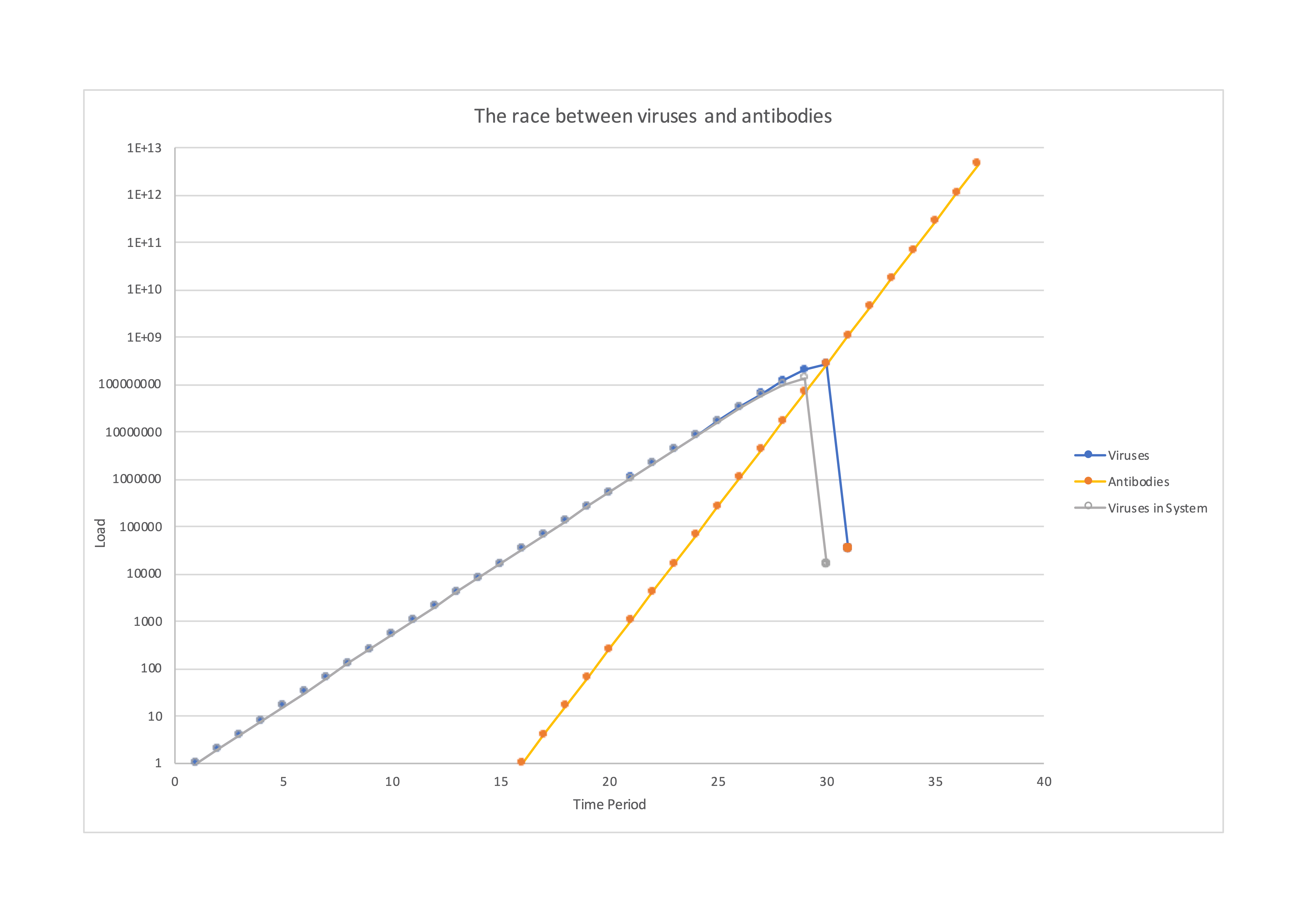 In the figure below, viruses start doubling at time 1 (first exposure), while antibodies (and CTLs) don't start until time 16, but they double twice as fast. By time period 28, they start to noticeably slow the growth of viruses, and due to the power of compound interest, effectively destroy them by time period 30. Assuming the patient can survive a load of 10 million viruses in their body, everything is fine. But there is a threshold, and if the antibodies aren't fast enough (start too late, double too slowly), the patient won't make it.